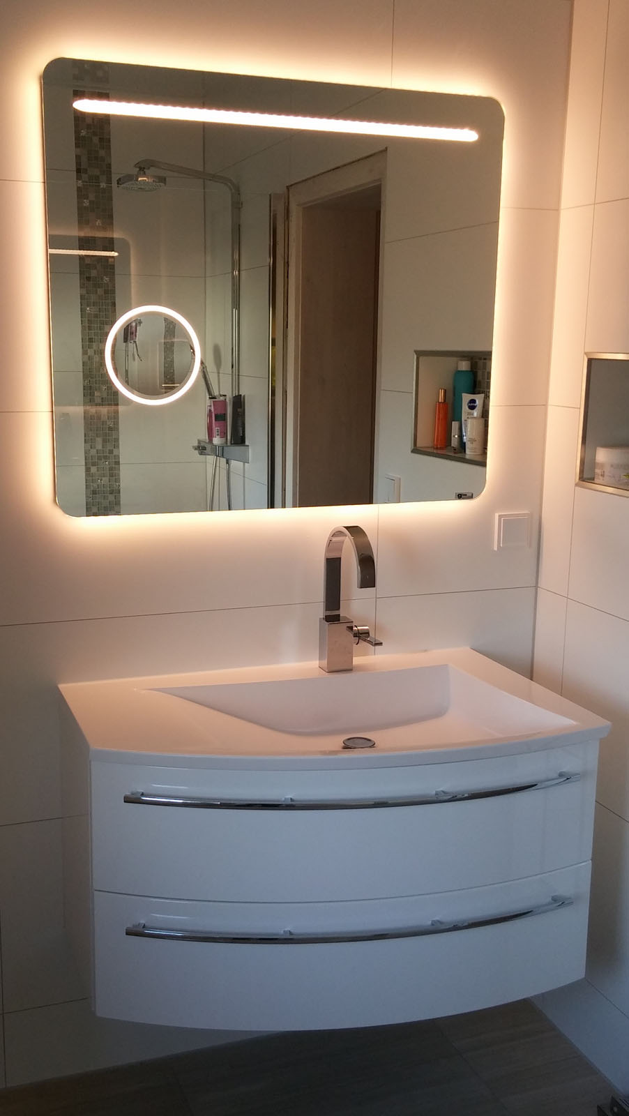 Entdecken Sie unsere LED-Lampen und Ambientebeleuchtung, die Ihr Badezimmer optimal ausleuchten und eine stimmungsvolle Atmosphäre schaffen. Praktisch, modern und auf Wunsch dimmbar – für perfekten Komfort und Design.