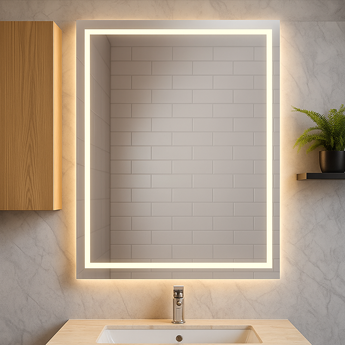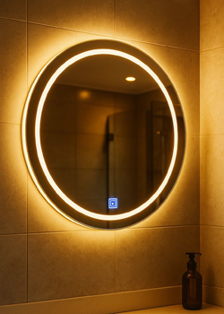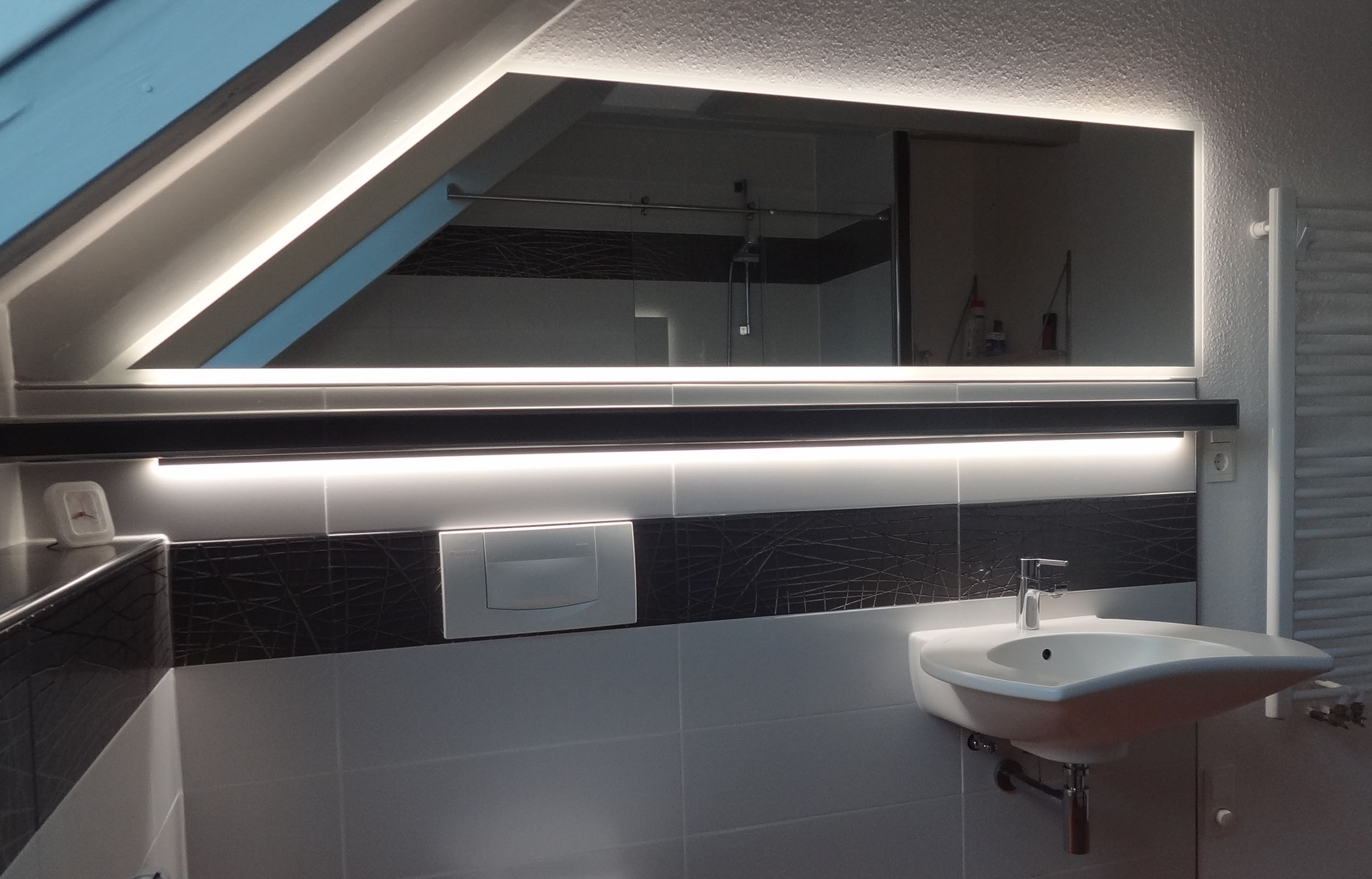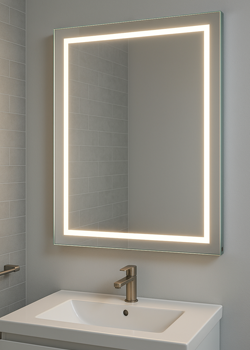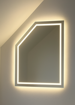 Das leistungsstarke 9-Watt-LED-Band wird umlaufend auf der Rückseite Ihres Badspiegels montiert und sorgt für einen seitlichen, weichen Lichtschein an der Wand. Die geschützte LED im Aluminiumprofil erzeugt eine harmonische, warme Atmosphäre – ideal als stimmungsvolle Hintergrundbeleuchtung. Auf Wunsch auch dimmbar.
