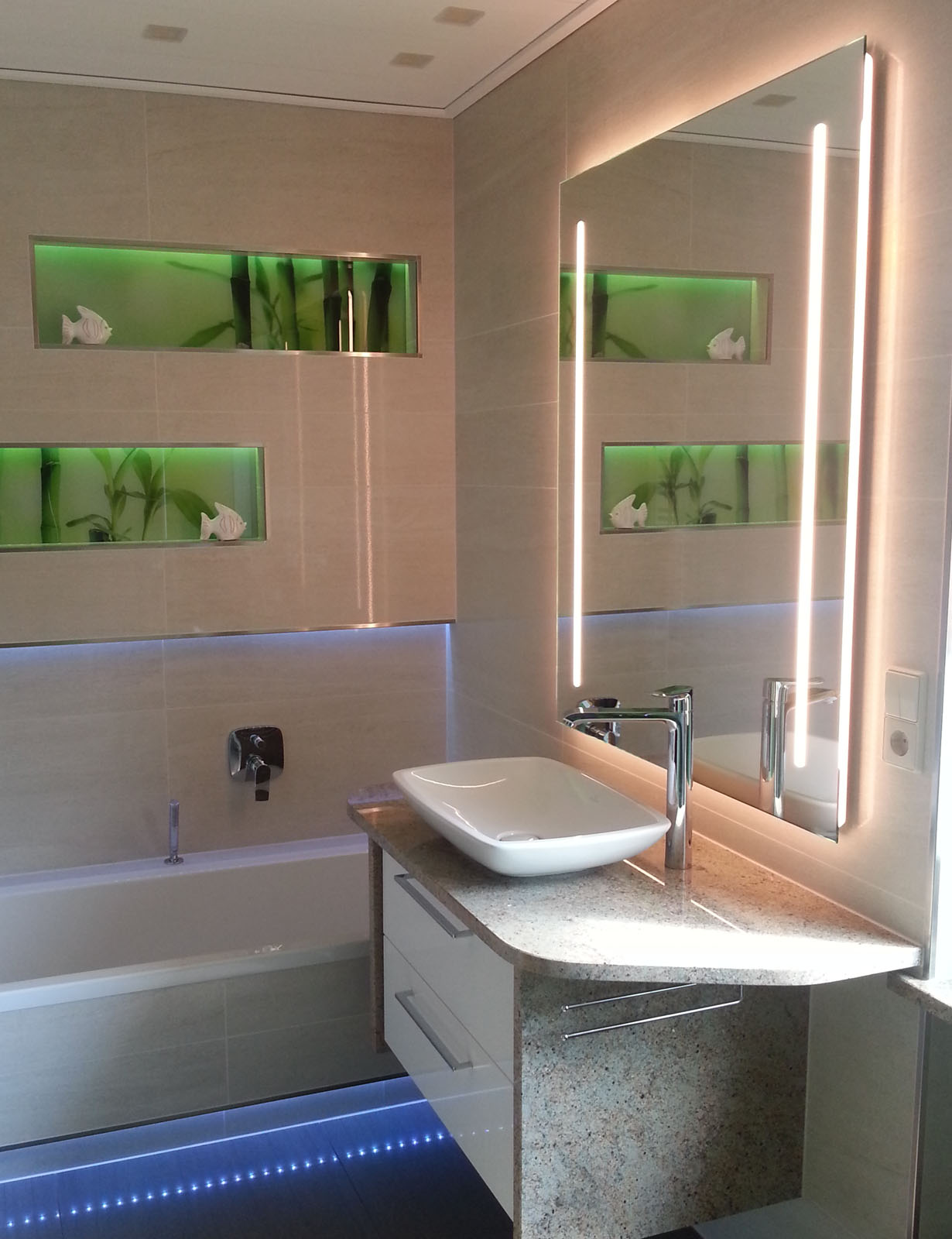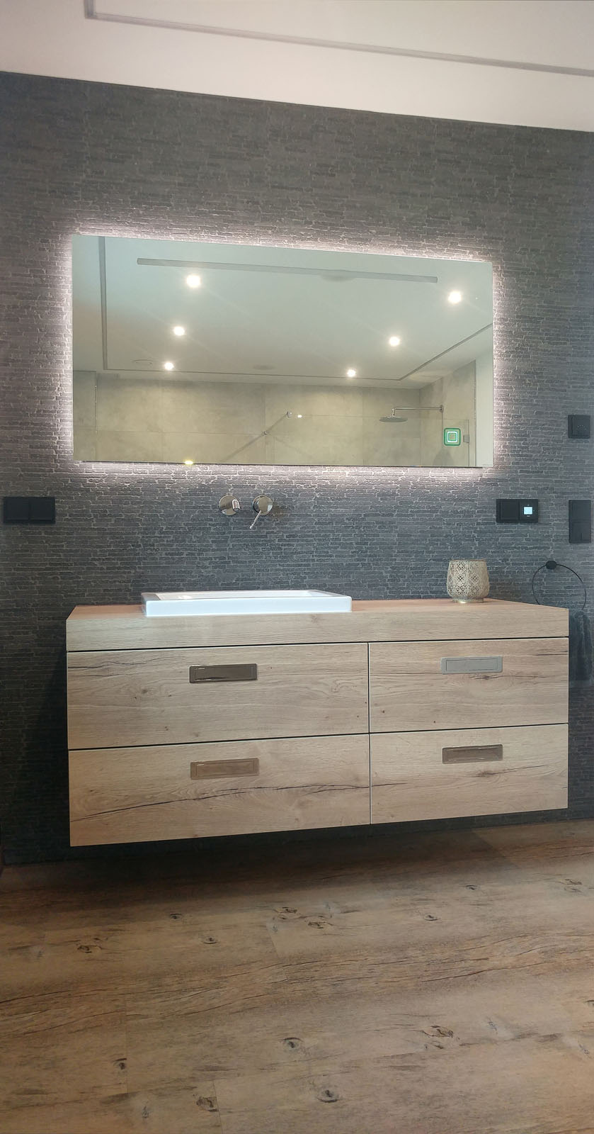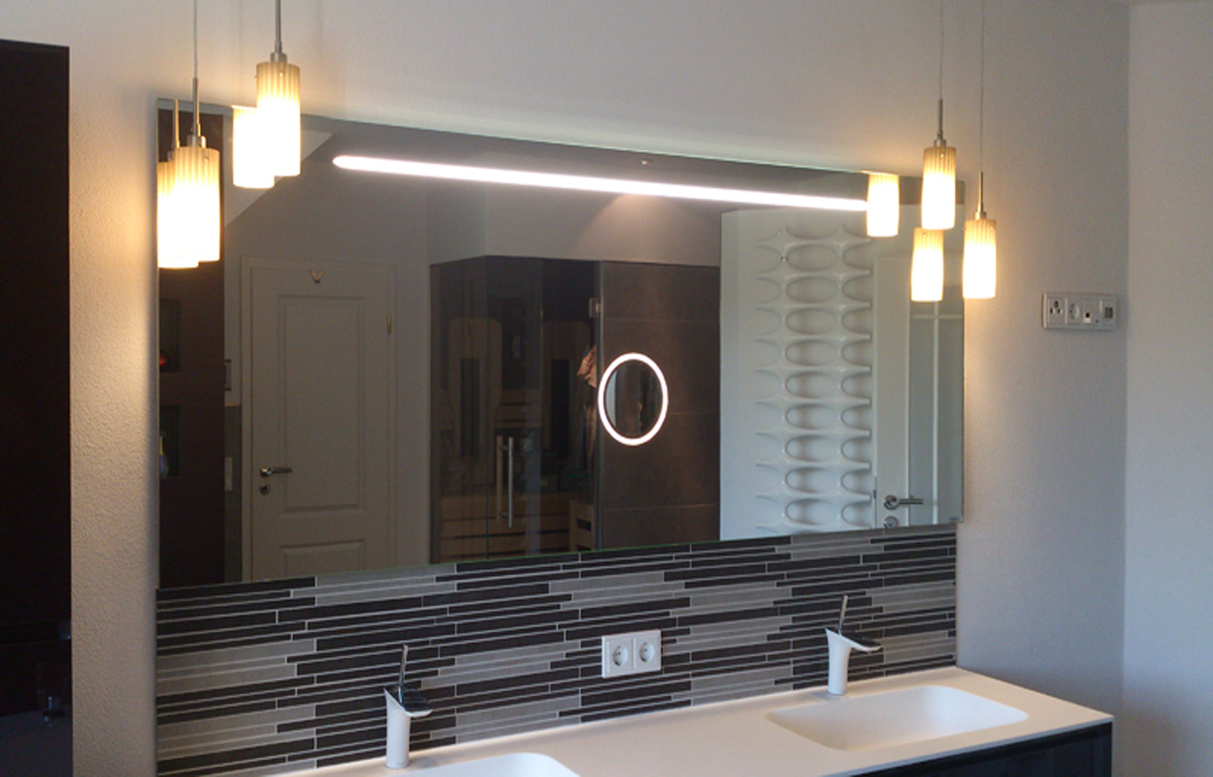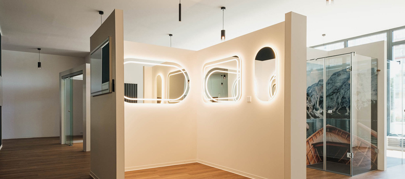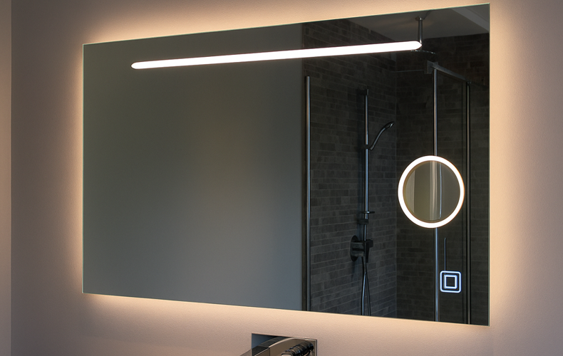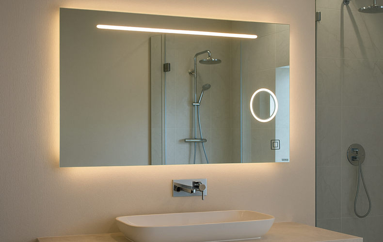 Wir fertigen Spiegel ganz nach Ihren Wünschen – individuell und passgenau. Für die Hauptbeleuchtung setzen wir hochwertige LED-Bänder ein, die für ein gleichmäßiges und angenehmes Licht sorgen.