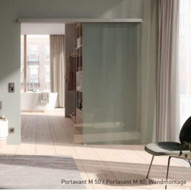 Portavant M 50 auch in unserer Ausstellung – ein effizientes Schiebesystem für leichte Glas-Schiebetüren. Mit dezentem Design, sanftem Lauf und platzsparendem Aufbau eignet er sich für moderne Innenräume und Raumtrennungen.